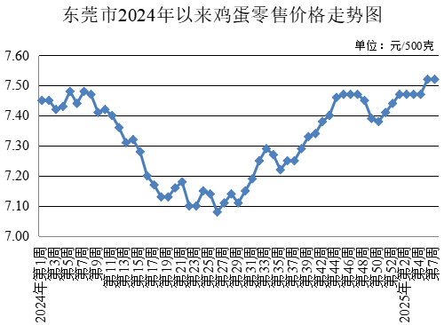 第7周,監(jiān)測(cè)的雞蛋農(nóng)貿(mào)市場(chǎng)零售均價(jià)為每500克7.52元,與上周持平。