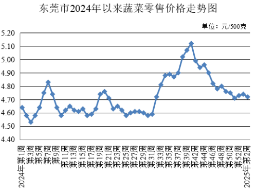 第2周,監(jiān)測的30種蔬菜農(nóng)貿(mào)市場零售均價(jià)為每500克4.72元,較上周下降0.42%。其中,葉菜類農(nóng)貿(mào)市場零售均價(jià)為每500克4.84元,較上周下降1.43%;非葉菜類農(nóng)貿(mào)市場零售均價(jià)為每500克4.63元,較上周上升0.22%。