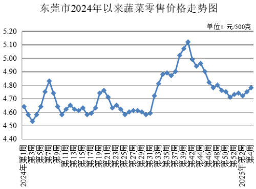 第4周,監(jiān)測(cè)的30種蔬菜農(nóng)貿(mào)市場(chǎng)零售均價(jià)為每500克4.78元,較上周上升0.63%。其中,葉菜類農(nóng)貿(mào)市場(chǎng)零售均價(jià)為每500克4.88元,較上周上升0.62%;非葉菜類農(nóng)貿(mào)市場(chǎng)零售均價(jià)為每500克4.69元,較上周上升0.43%。